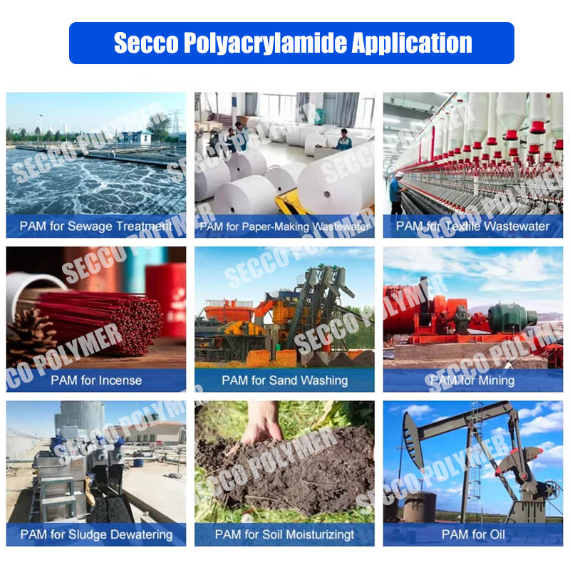 Паліакрыламідная эмульсія шырока выкарыстоўваецца ў розных бытавых сцёкавых водах, хімічных сцёкавых водах, сцёкавых водах нафтавых палёў, абводжэнні шлама, паперы і іншых галінах. Паліакрыламідная эмульсія вады ў алеі таксама шырока выкарыстоўваецца ў гарадской ачыстцы сцёкавых вод, піваварні, крахмальнай фабрыцы, харчовых заводах і іншых ачыстках сцёкавых вод. Асабліва прымяняецца выдаленне флокуляцыі арганічных суспензаваных цвёрдых рэчываў у кіслатых або кіслатых адтоках. У папяровай прамысловасці ён можа быць выкарыстаны ў якасці фільтра, які дапамагае захоўваць паперу, ачысткі сцёкавых вод. Нафтавая прамысловасць можа быць выкарыстана ў якасці свідравання эмульсіі пакрыцця агента або адтлушчэння агента.